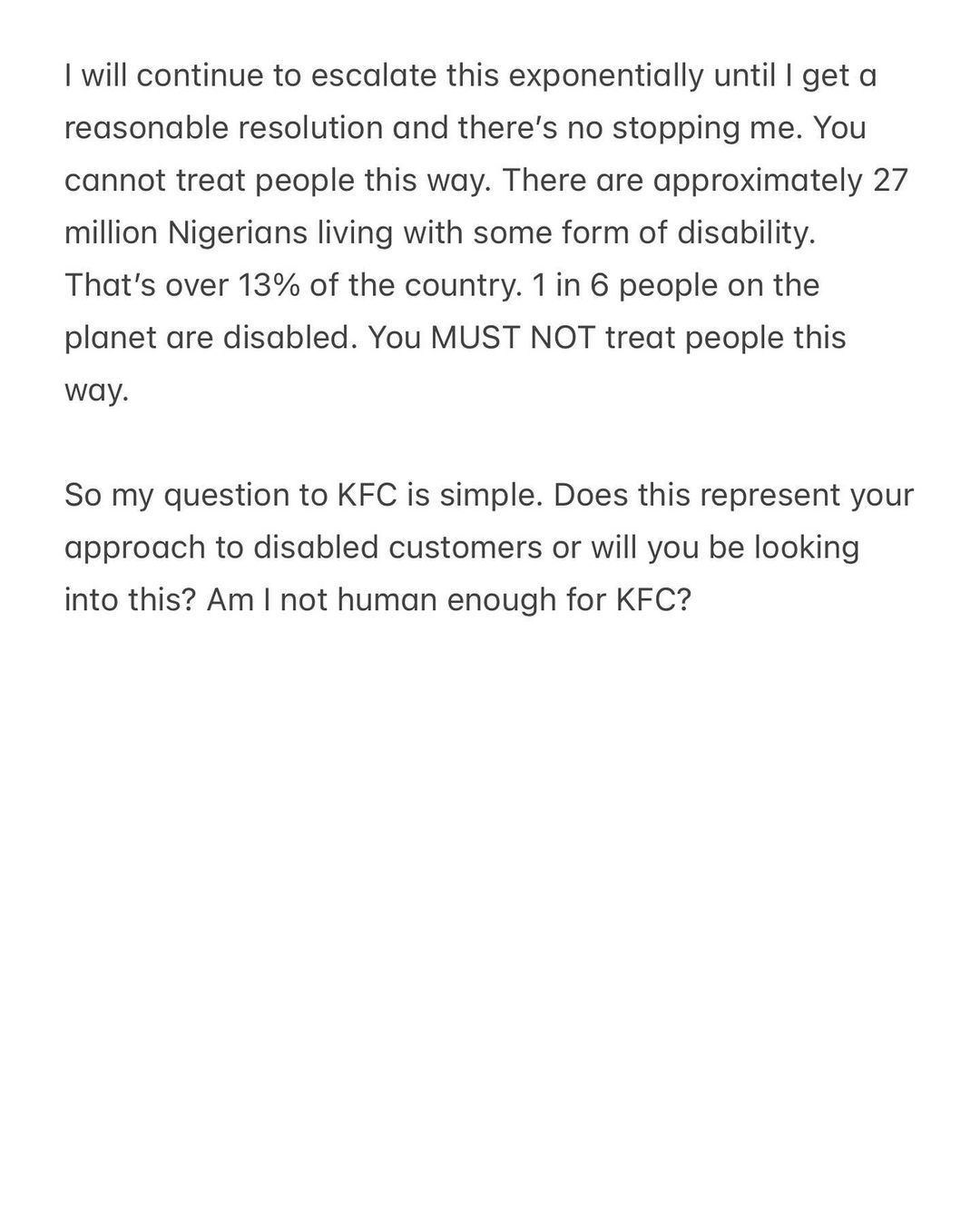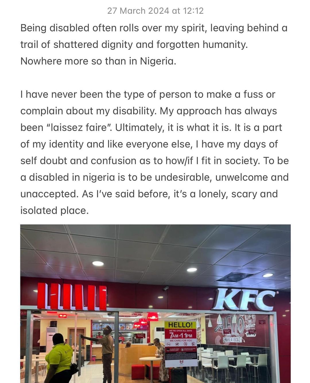 The incident, which unfolded at a KFC outlet when he was on his way out of the country with his siblings and wife, revealed the systemic barriers encountered by people with disabilities in Nigeria. Despite the enactment of legislation aimed at promoting inclusivity and accessibility, many establishments continue to fall short in providing equal opportunities for all.