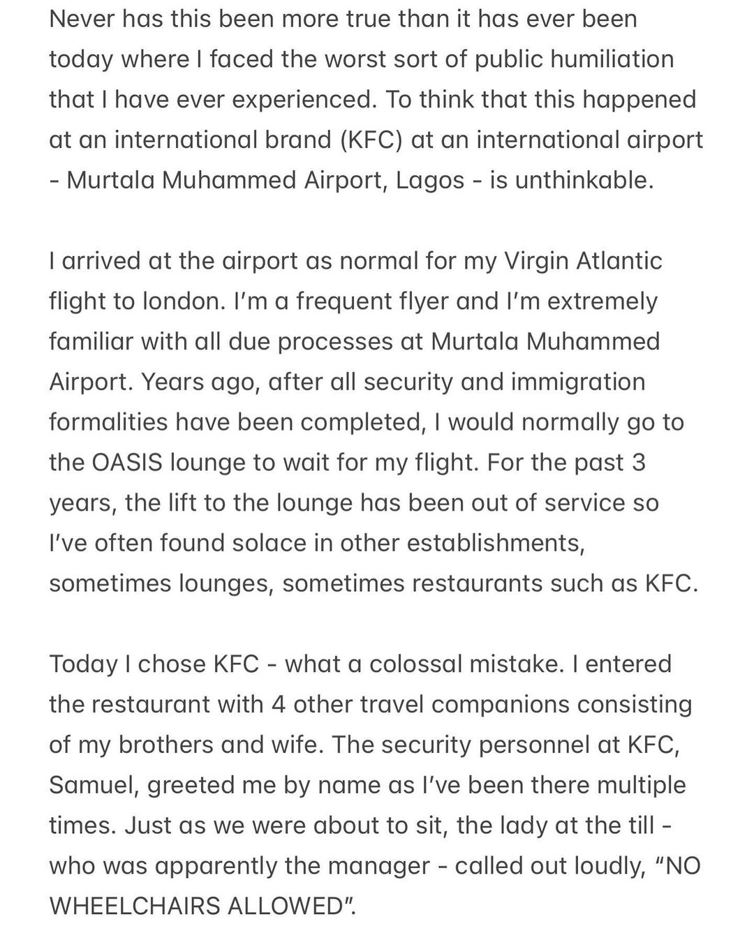 Despite being a prominent figure’s offspring, the young man, who relies on a wheelchair for mobility, was denied access to the lounge area of a popular fast food restaurant, KFC, located inside the departure hall of MM International in Lagos.