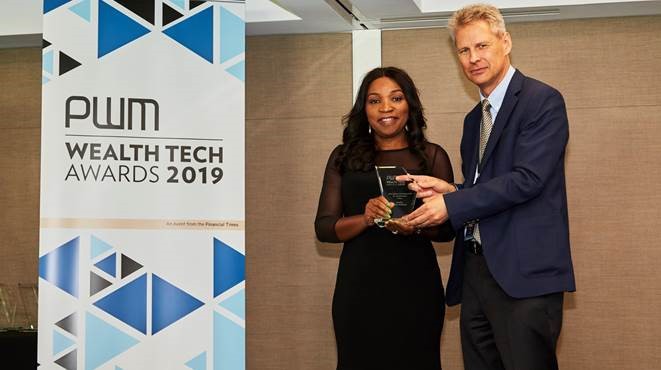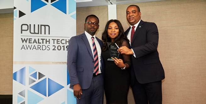 Divisional Head, Fidelity Private banking, Chioma Nwankwo (middle) with Head, Investor Relations, Sam Obioha, and Chief Operations & Information Officer, Gbolahan Joshua, at the PWM Wealth Tech Award in London where Fidelity Bank emerged the ‘Best Digital Networking Bank For Entrepreneurs, Africa 2019’ recentlyEditor-in-Chief, Professional Wealth Management at Financial Times, Yuri Bender, presenting the Wealth Tech Award to Divisional Head, Fidelity Private Banking, Chioma Nwankwo in London where Fidelity Bank emerged the ‘Best Digital Networking Bank For Entrepreneurs, Africa 2019’ recently.