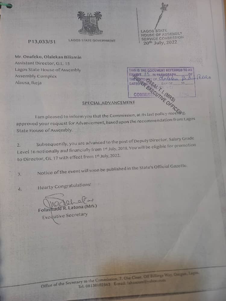 In the letter dated July 20, 2022, titled: “Special Advancement” and addressed to Onafeko, the terse letter read: “I am pleased to inform you that the Commission (Lagos Assembly Service Commission), at its last policy meeting approved your request for advancement, based upon the recommendation from Lagos House of Assembly.