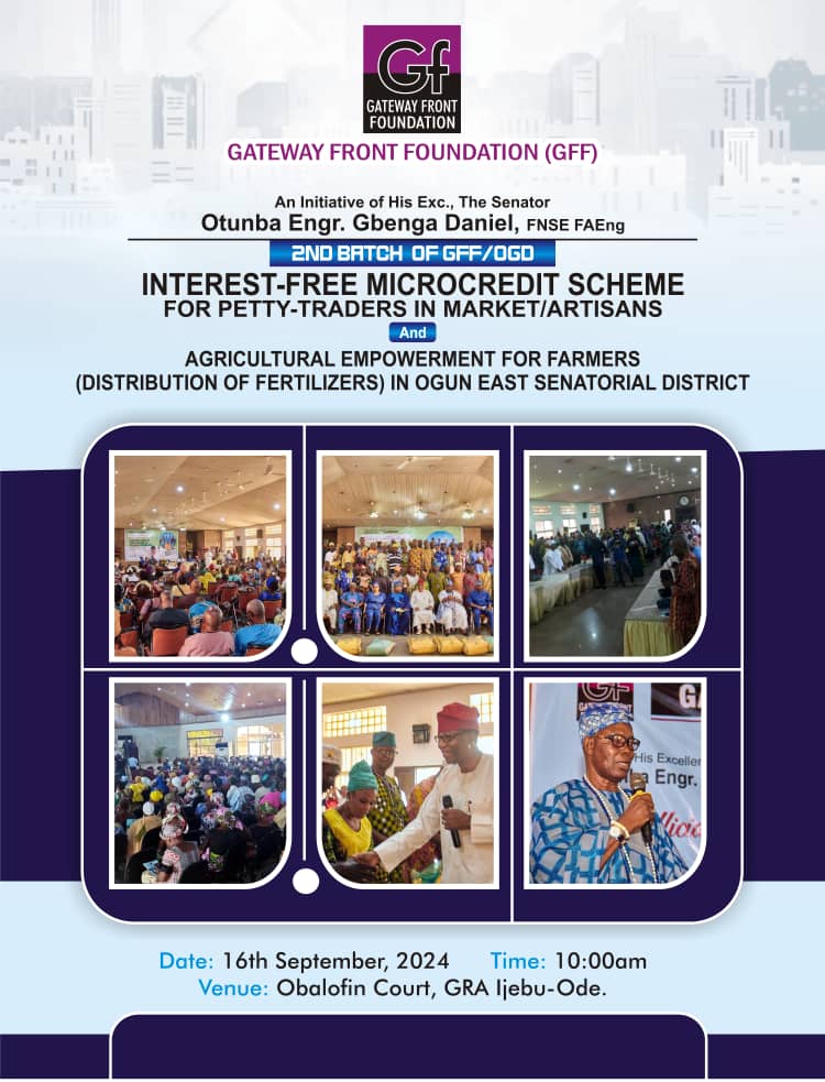 The Gateway Front Foundation (GFF), under the leadership of His Excellency, Senator, Otunba Gbenga Daniel, FNSE FAEng, is set to launch the second batch of its Interest-Free Microcredit Scheme on September 16, 2024. This initiative, designed to uplift petty traders, artisans, and farmers within the Ogun East Senatorial District, will take place at Obalofin Court, GRA Ijebu-Ode, beginning at 10:00 AM.