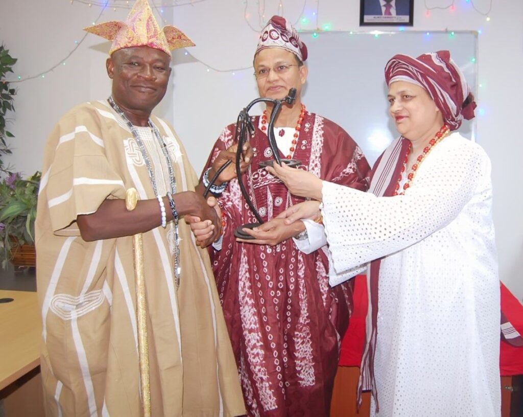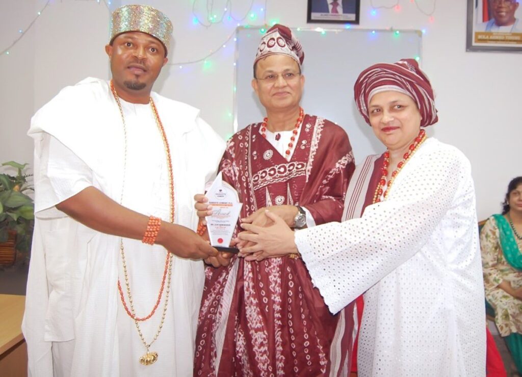 Outgoing Dangote Cement, Ibese Plant Director, Azad Nawabuddin (middle) receiving an award from the Aboro of Ibeseland, Oba Rotimi Mulero (left) and his wife, Romana, during the sent forth ceremony by the Ibese Plant management.