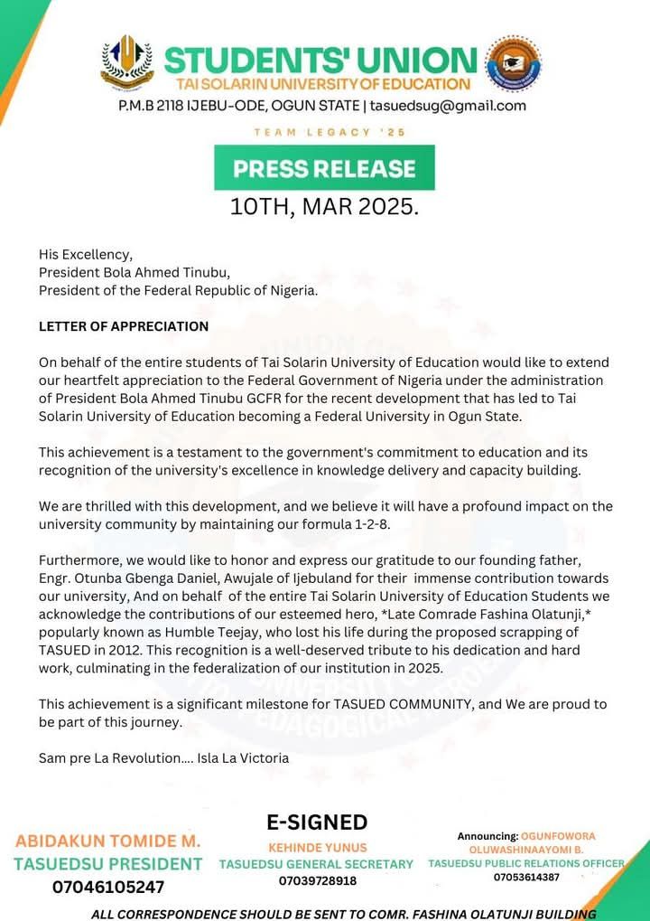 The Tai Solarin University of Education (TASUED) Student Union has applauded the Federal Government for adopting the institution as a federal university, securing its future after years of financial struggles under Ogun State leadership.