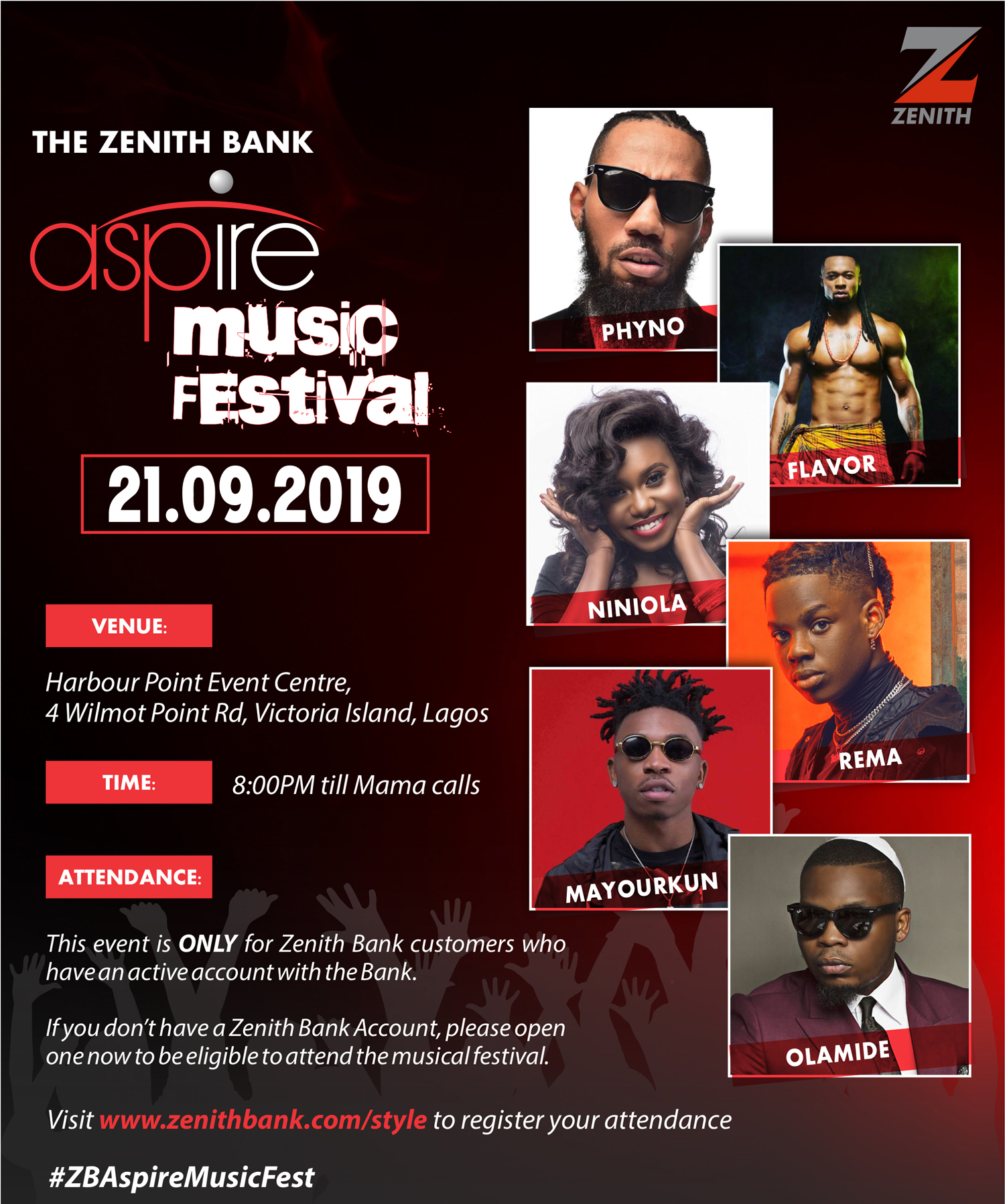 Nigeria’s leading financial institution, Zenith Bank Plc, is set to light up the social and entertainment scene this month with the announcement of the Bank’s “Aspire Music Festival”.